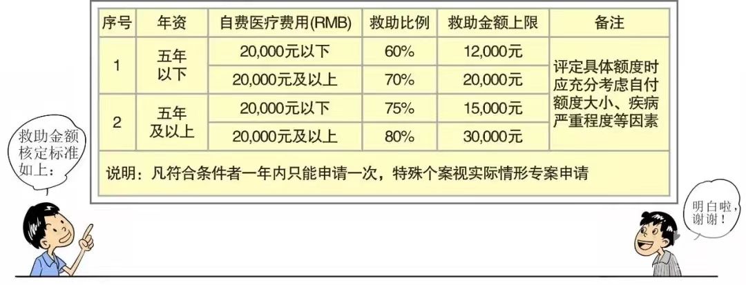 為了治療疾病,小王自費金額41,024.69元。在了解到集團工會的困難員工救助幫扶政策之后,他結合自身情況,向工會申請了困難員工救助金。工會根據小王提交的資料,結合他的年資和自費金額計算之后,按照相關政策確定救助比例為80%,給予救助金30,000元。