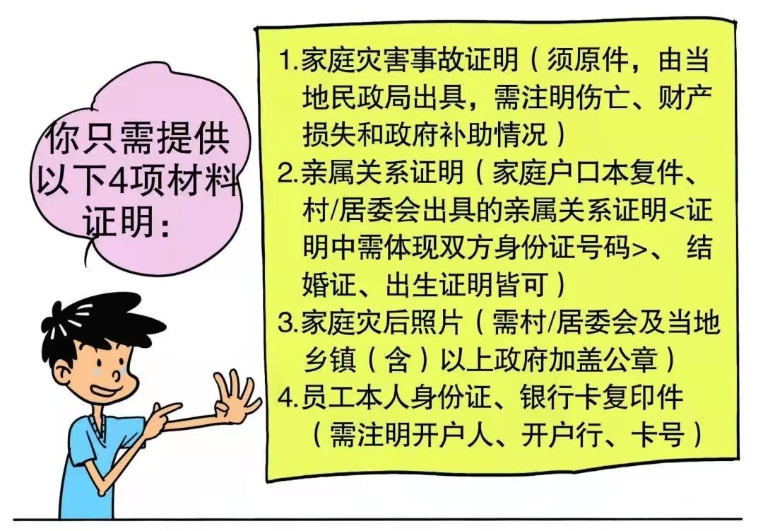 1.家庭災害證明原件(由當地民政局出具,注明傷亡、財產損失和政府補助情況;村委會及當地民政局加蓋公章)