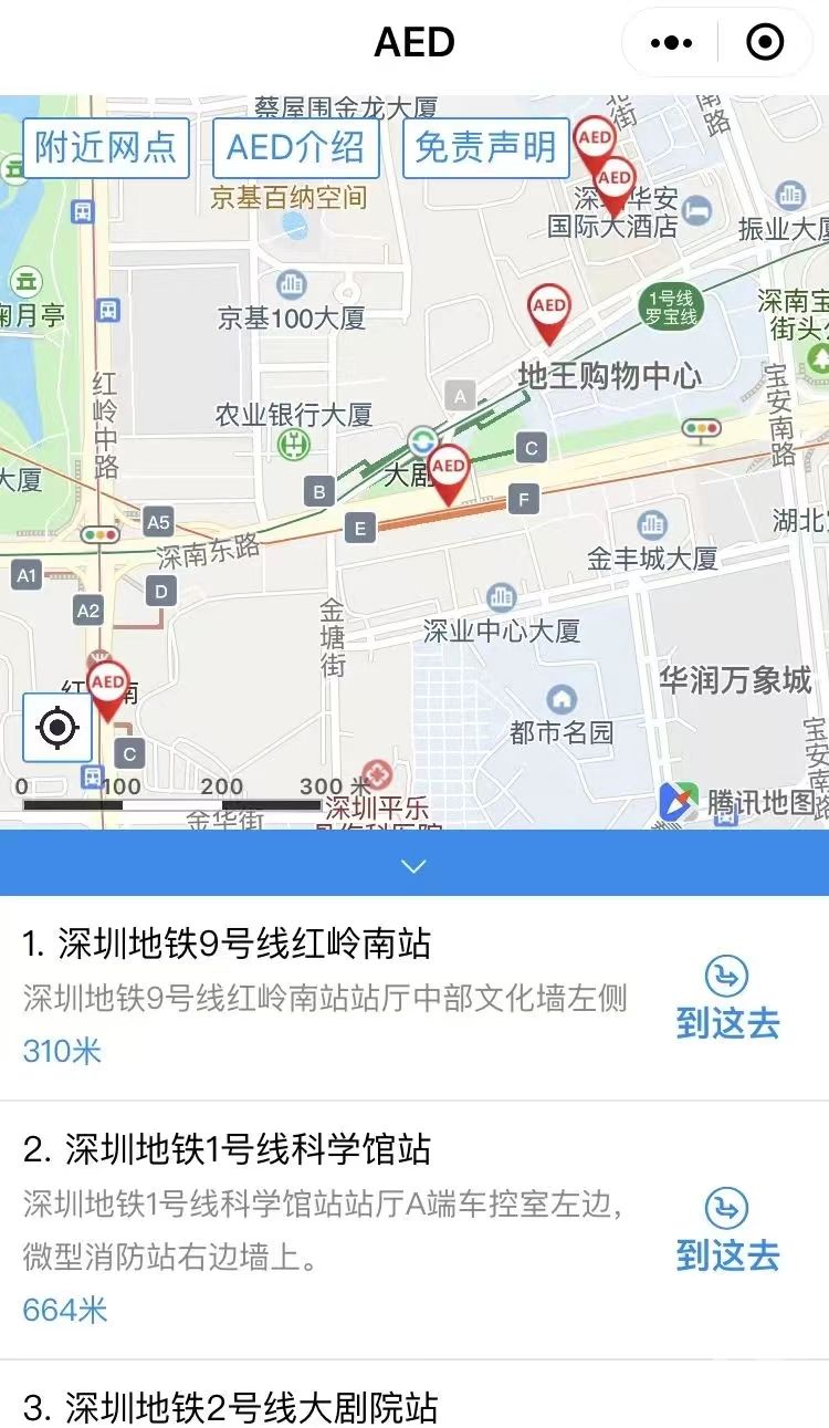 為方便市民找到AED,深圳市急救中心2018年聯合騰訊發布了覆蓋全城、一鍵可查的深圳“AED地圖”。打開“騰訊地圖”或者微信小程序,在搜索欄中輸入“AED導航”就會顯示離你最近的幾臺AED,根據導航提示即可前往取出。